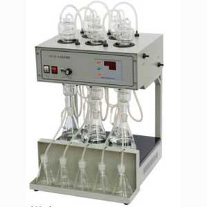 產品簡介: 蒸餾器(氨氮蒸餾器、揮發酚蒸餾器、氰化物蒸餾器)采用的遠紅外加熱方法,儀器可選配外置水冷卻循環裝置,蒸餾過程中通入恒定流量的正壓氣體,可使蒸餾速度和蒸餾效率增加。 產品參數: 1.可同時蒸餾5個樣品。 2.加熱功率可調,可按100w間隔調節,加熱功率1600W。 3.加熱時間可調,定時時間為2小時30分鐘,定時時間10分鐘。 4.選配外置水冷卻循環裝置,同時對5根冷凝管冷卻。 5.內置氣體發生器,分別對5個蒸餾瓶中溶液吹氣。 6.電源要求:220V(10A)。 使用方法: 1.加入150mL的樣品于5個蒸餾瓶中,于蒸餾瓶的上面放入回流管,回流管另一端的塑料管在吸收瓶的下面。 2.加入100mL的硼酸吸收液于四個接收瓶中,將接收瓶放置于儀器左右二側的冷凝管下面,冷凝管的末端硅橡膠管在吸收液的液面下。 3.打開儀器左側的冷卻水、吹氣電源開關,蒸餾瓶中氣流和冷凝管中的水流通暢。 4.打開電爐的電源開關。儀器顯示內置的加熱功率“1000”瓦,按“+”、“-”鍵調整加熱功率至“500”瓦。按“定時”鍵后儀器顯示“00:00”,再按“+”、“-”鍵調整定時時間至“00:20”。此時表示定時時間為20分鐘。此后儀器自動按設定的功率定時加熱,到加熱結束。電爐加熱時間,儀器自動顯示“OFF”。此時雖然然停止加熱,但電爐的冷卻風扇繼續工作,排掉余熱。如在加熱的過程中改變加熱功率,那么定時時間需重置。 5.取下接收瓶,定容250mL后,用于后續的滴定。 6.待蒸餾瓶中溶液冷卻到室溫后,關閉儀器左側的冷凝水、吹氣電源開關。 7.在做其它樣品分析時,定時時間和加熱功率用戶應根據實驗要求,自行確定。