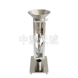 產品簡介: 斯柯特容計法松裝密度測試儀是根據GB/T 5060《金屬粉末松裝密度的測法2:斯柯特容量計法》、ISO3932/2 《金屬粉末松裝密度的測定2:斯柯特容量計法》。該測試裝置適用于不能自由流過漏斗法中孔徑為5mm的漏斗和用振動漏斗法易改變特性粉末。 檢測原理: 粉末放入上組合漏斗中的篩網上,流入布料箱,經過布料箱中的四塊傾斜角為25°的玻璃板和方形漏斗,流入已知體積的圓柱杯中,呈松散狀態。然后稱量圓柱杯中的粉末的重量。 規格參數: 上組合漏斗:由兩個不銹鋼圓錐形漏斗組成,其間一段圓柱隔開,并放入一個孔徑為1.18mm的不銹鋼篩網。 布料箱:橫斷面為正方形,內有四塊1mm厚不銹鋼板斜鑲嵌在鋁制的框架上,框架前后兩壁面是有機玻璃板;不銹鋼板可拔出。 方形漏斗:1mm厚不銹鋼板焊接,傾斜角度60°的方錐體,下口徑為12.5mm×12.5mm。 圓柱杯:容積為 25ml。 鐵臺架:用于支撐上組合漏斗、布料箱、方形漏斗、圓柱杯等。 天平:用于稱量粉末樣品,0.05g (自備)